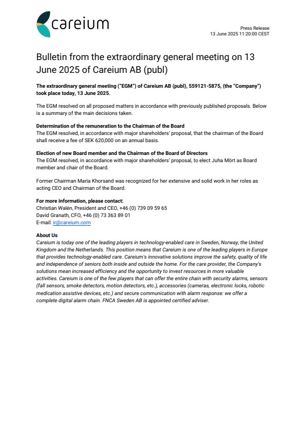 The extraordinary general meeting (“EGM”) of Careium AB (publ), 559121-5875, (the “Company”) took place today, 13 June 2025.