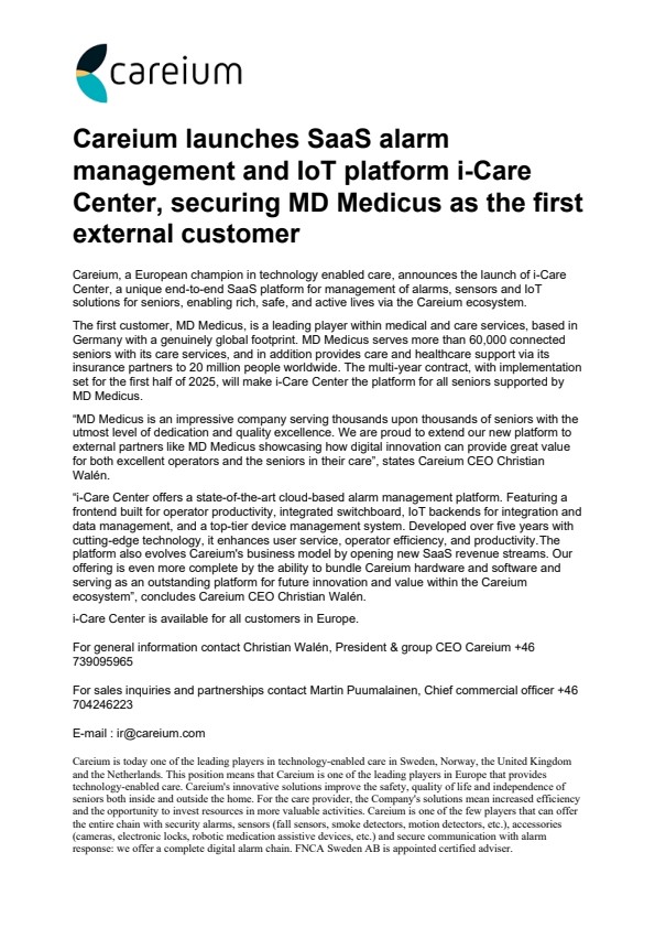 The first customer, MD Medicus, is a leading player within medical and care services, based in Germany with a genuinely global footprint. MD Medicus serves more than 60,000 connected seniors with its care services, and in addition provides care and healthcare support via its insurance partners to 20 million people worldwide. The multi-year contract, with implementation set for the first half of 2025, will make i-Care Center the platform for all seniors supported by MD Medicus.