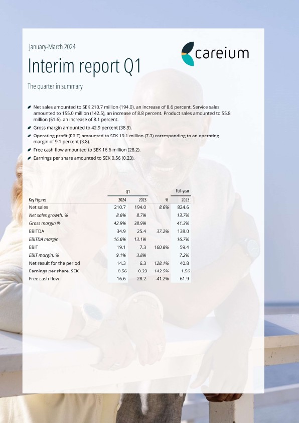 Careium delivered net sales of SEK 210.7 million (194.0), an increase of 8.6 percent. Gross margin increased to 42.9 percent (38.9) reflective of our work to continuously effectives our business and active steering of the product mix. We delivered a markedly increased EBIT of SEK 19.1 million (7.3), corresponding to an operating margin of 9.1 percent (3.8), an increase of 160.8 percent. Organic growth continued with an increase of 8.8 percent in services year-on-year and corresponding 8.1 percent increase in product sales reflecting the demand for our innovative hardware. Free cash flow generated was SEK 16.6 million (28.2). While the quarter’s free cash flow was lower than previous year, the latest six-month free cash flow including Q4 2023 reached SEK 52.4 million, a significant increase from SEK -25.2 million the year before.
