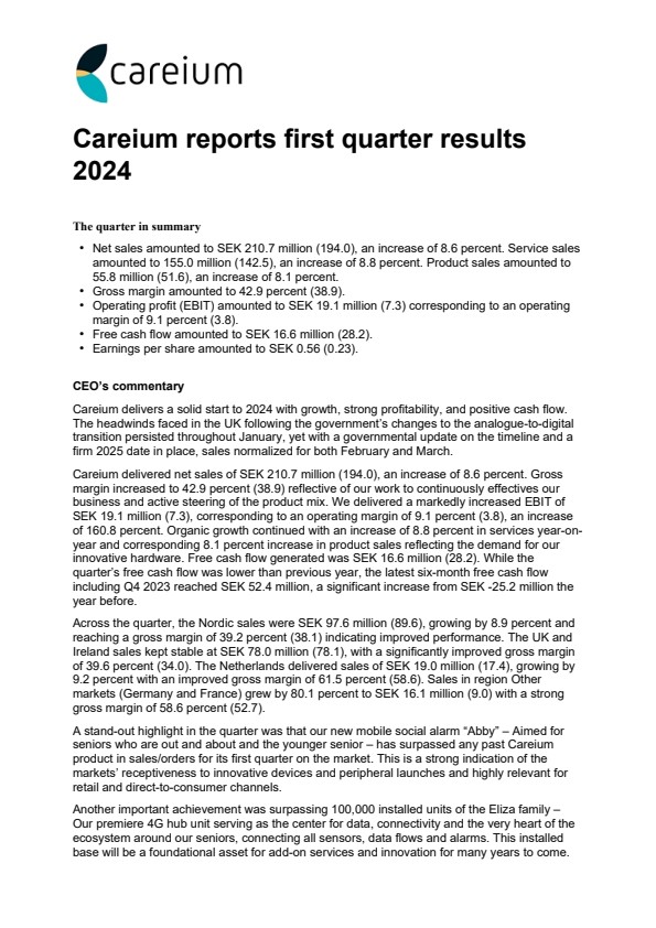 During the quarter our UK business has taken its next steps toward greater efficiencies building on the changes made during winter – 65% increase in local EBITDA vs first quarter 2023 and multiple contract wins in the SEK 1-3 million per annum range. I’m also proud, as both CEO and interim UK director, to hand over the UK reins to industry veteran Joe McLoughlin, joining as permanent director for UK starting 3 June 2024. Joe’s strong multi-year sector experience, leadership, and unique combination of a commercial and technical background with strong industry networks is the perfect combination to lead Careium UK and its talented teams.