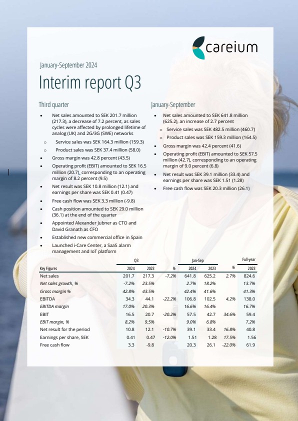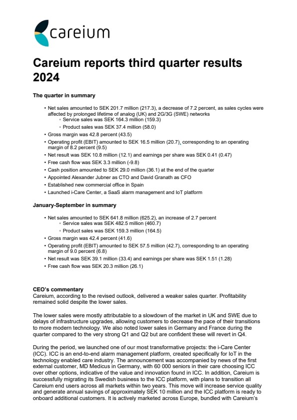 Careium will publish the report for the third quarter of 2024 on Friday 25 October 2024 at 8am (CEST).