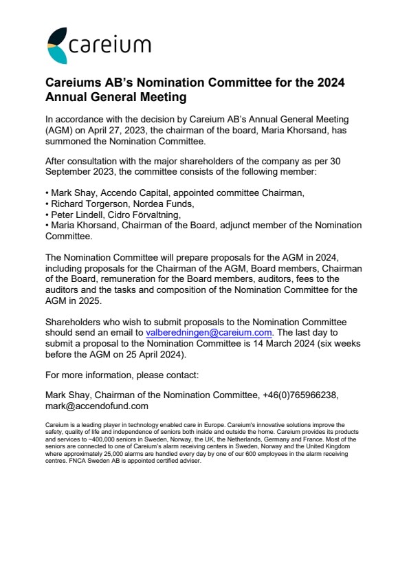 Shareholders who wish to submit proposals to the Nomination Committee should send an email to valberedningen@careium.com. The last day to submit a proposal to the Nomination Committee is 14 March 2024 (six weeks before the AGM on 25 April 2024).