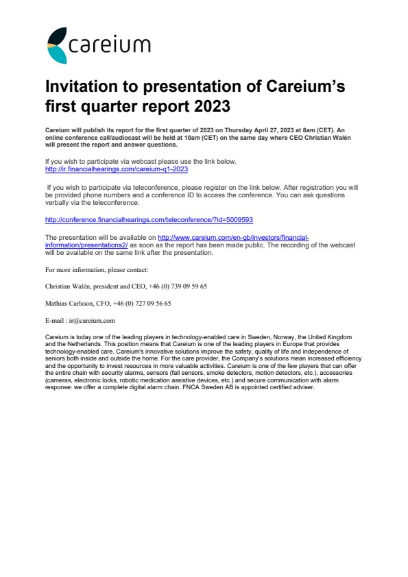 Careium will publish its report for the first quarter of 2023 on Thursday April 27, 2023 at 8am (CET). An online conference call/audiocast will be held at 10am (CET) on the same day where CEO Christian Walén will present the report and answer questions.