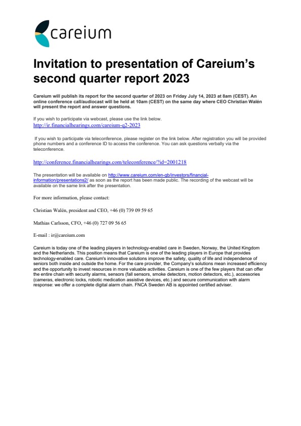Careium will publish its report for the second quarter of 2023 on Friday July 14, 2023 at 8am (CEST). An online conference call/audiocast will be held at 10am (CEST) on the same day where CEO Christian Walén will present the report and answer questions.