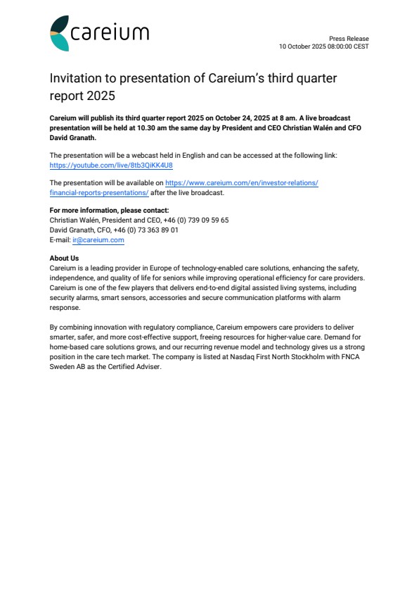 Careium will publish its third quarter report 2025 on October 24, 2025 at 8 am. A live broadcast presentation will be held at 10.30 am the same day by President and CEO Christian Walén and CFO David Granath.