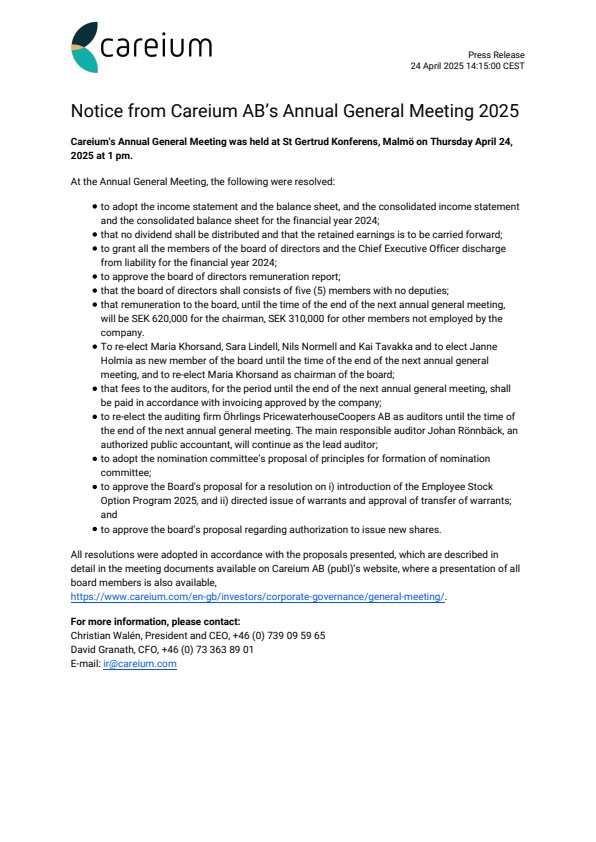 Careium’s Annual General Meeting was held at St Gertrud Konferens, Malmö on Thursday April 24, 2025 at 1 pm.