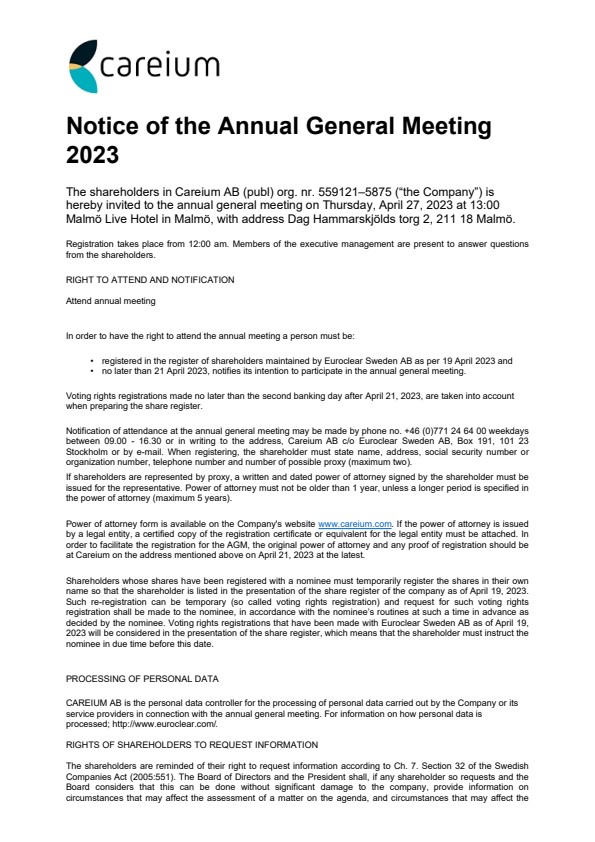 Power of attorney form is available on the Company’s website www.careium.com. If the power of attorney is issued by a legal entity, a certified copy of the registration certificate or equivalent for the legal entity must be attached. In order to facilitate the registration for the AGM, the original power of attorney and any proof of registration should be at Careium on the address mentioned above on April 21, 2023 at the latest.