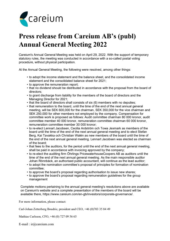 Careium’s Annual General Meeting was held on April 29, 2022. With the support of temporary statutory rules, the meeting was conducted in accordance with a so-called postal voting procedure, without physical participation.