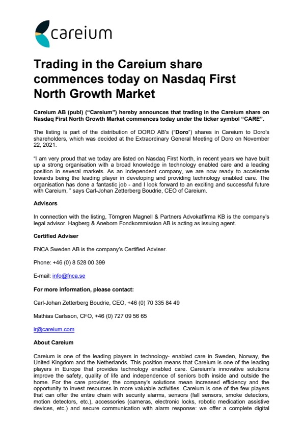 The listing is part of the distribution of DORO AB’s (“Doro”) shares in Careium to Doro’s shareholders, which was decided at the Extraordinary General Meeting of Doro on November 22, 2021.